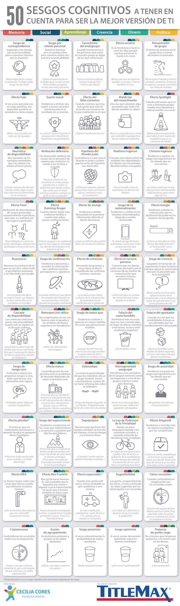 Un sesgo cognitivo es un efecto psicológico que produce una desviación en el procesamiento mental, lo que lleva a una distorsión, juicio inexacto, interpretación ilógica Puesto que los sesgos que nos acechan son imposibles de eliminar, la manera más eficaz de minimizar sus efectos es por medio del conocimiento de dichos sesgos y de la autocrítica.
